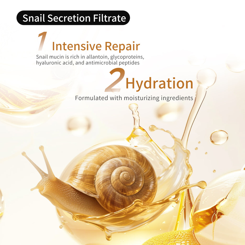 Snail mucin is rich in allantoin, glycoproteins, hyaluronic acid, and antimicrobial peptides that help to repair damaged skin, reduce fine lines, and improve skin elasticity. -