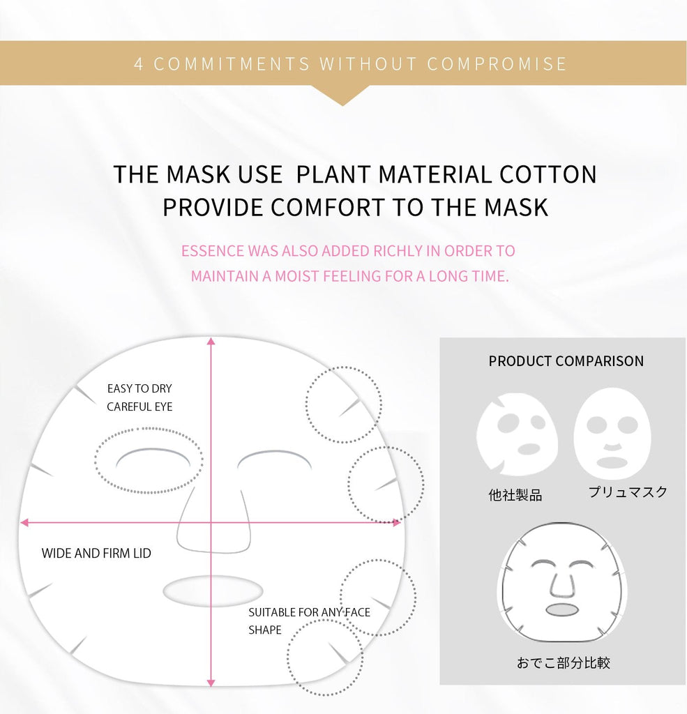 手ごろな値段でお試しできるよう1枚入りを含め、大容量パックの総シートマスク50枚分のセットをおまけでセット構成しました。