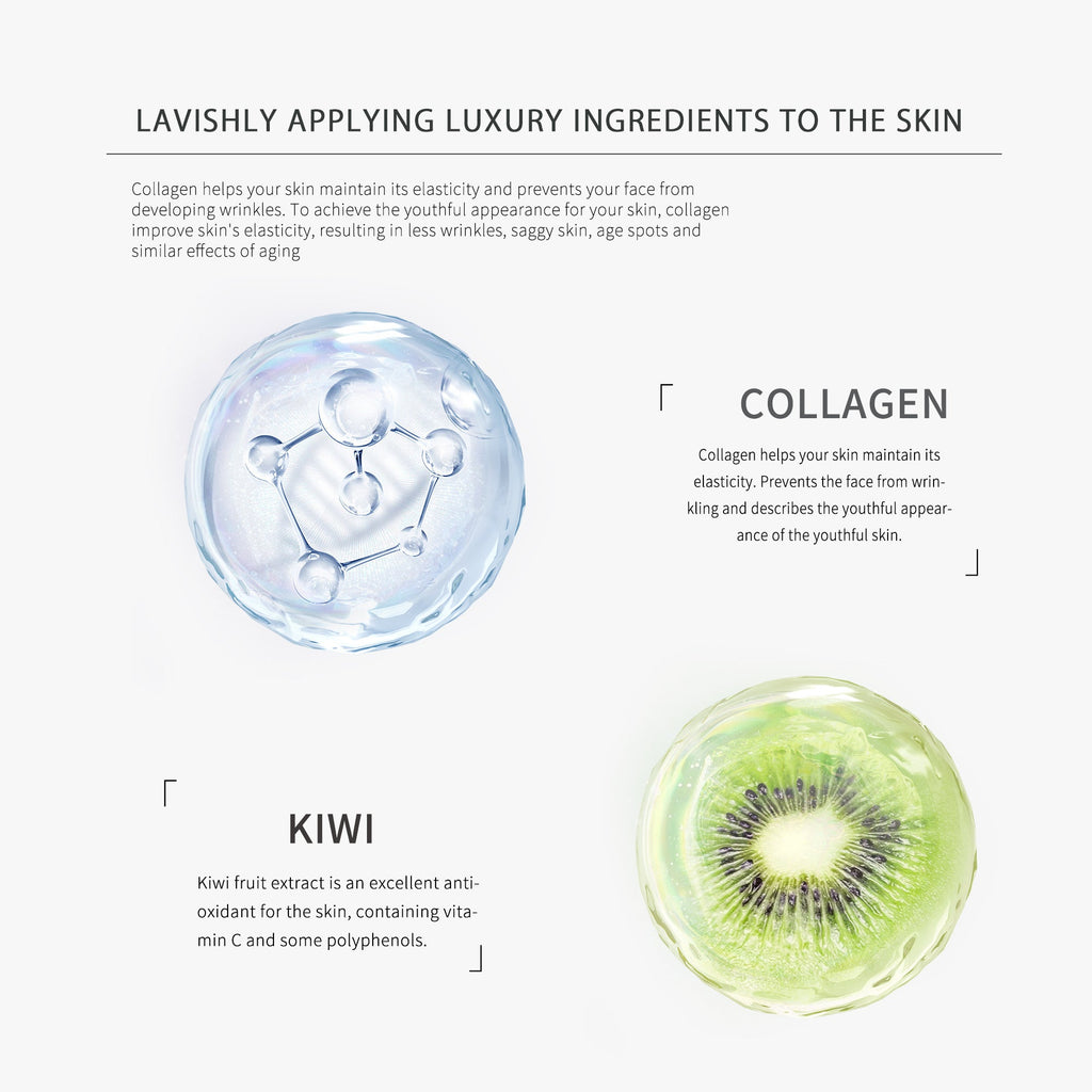 Water, Glycerin, Butylene Glycol, Dipropylene Glycol, Phenoxyethanol, Chlorphenesin, Allantoin, Carbomer, Panthenol, PEG-60 Hydrogenated Castor Oil, TEA, EDTA-2Na, Aloe Barbadensis Leaf Extract, Sodium Hyaluronate, Boswellia Serrata Resin Extract, Hydrolyzed Collagen, Kiwi Extract, Ubiquinone, Ascorbyl Tetraisopalmitate, Fragrance, Sodium Polyacrylate