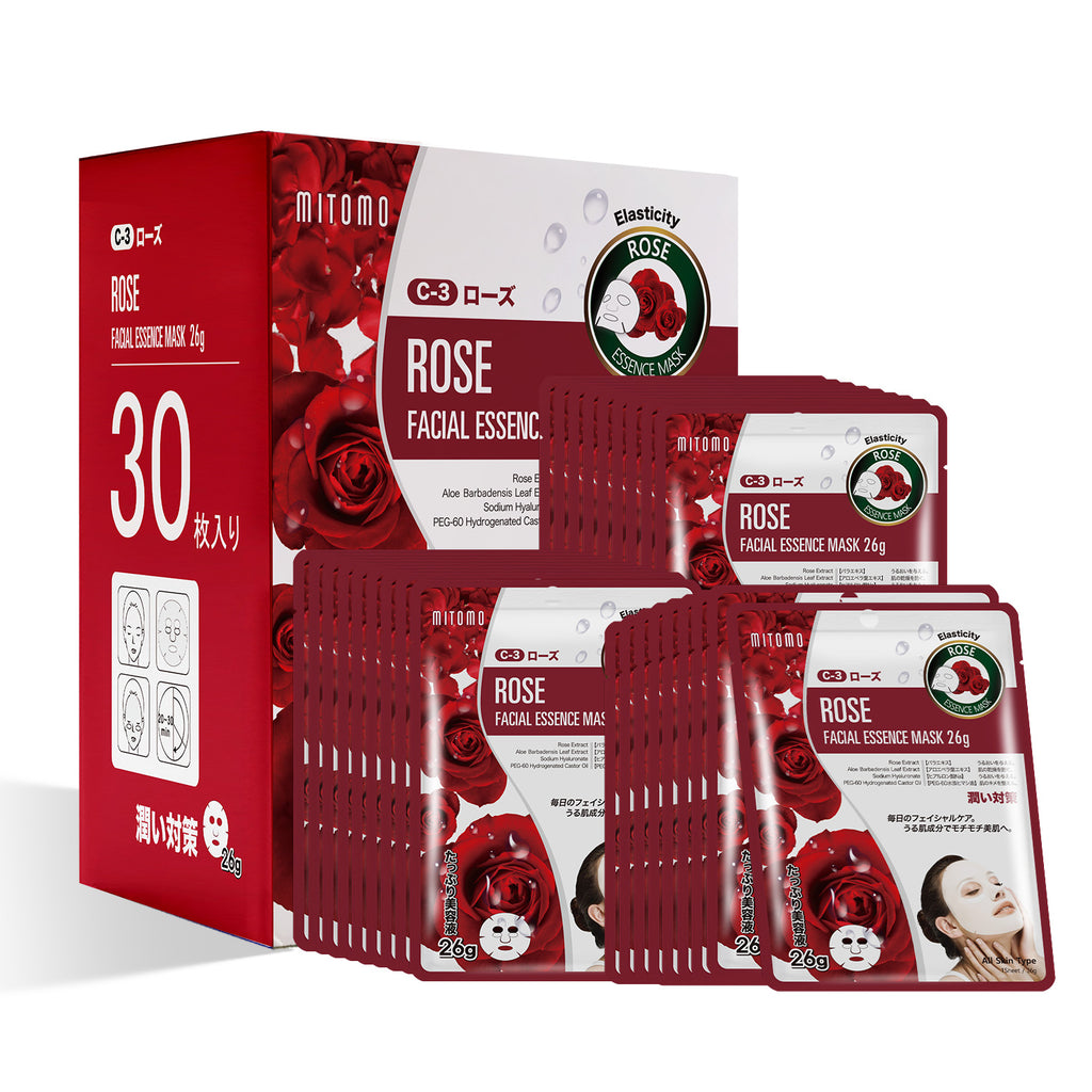 MITOMO Natural Rose Soothing Facial Essence Mask [MTSS00512-C-3J] - An essence mask packed with the gentleness of roses. It calms dry and sensitive skin with rose oil, while also balancing and evening out the skin tone. Aloe vera soothes inflammation and provides moisture to the skin. This mask is highly moisturizing and leaves the skin feeling smooth. The high-quality mask sheet adheres well to the face, providing a comfortable experience.