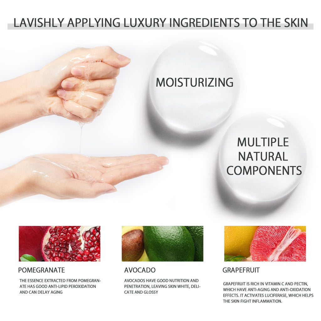 Water, Glycerin, Butylene Glycol, Dipropylene Glycol, Phenoxyethanol, Chlorphenesin, Allantoin, Carbomer, Panthenol, PEG-60 Hydrogenated Castor Oil, TEA, Fragrance, Persea Gratissima (Avocado) Fruit Extract, Punica Granatum (Pomegranate) Fruit Extract, Citrus Junos (Yuzu) Fruit Water, Disodium EDTA, Boswellia Serrata Resin Extract, Aloe Barbadensis Leaf Extract, Sodium Hyaluronate, Sodium Polyacrylate